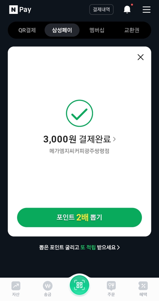 삼성페이로 결재를 했더니 결재즉시 네이버 포인트들이 들어왔다