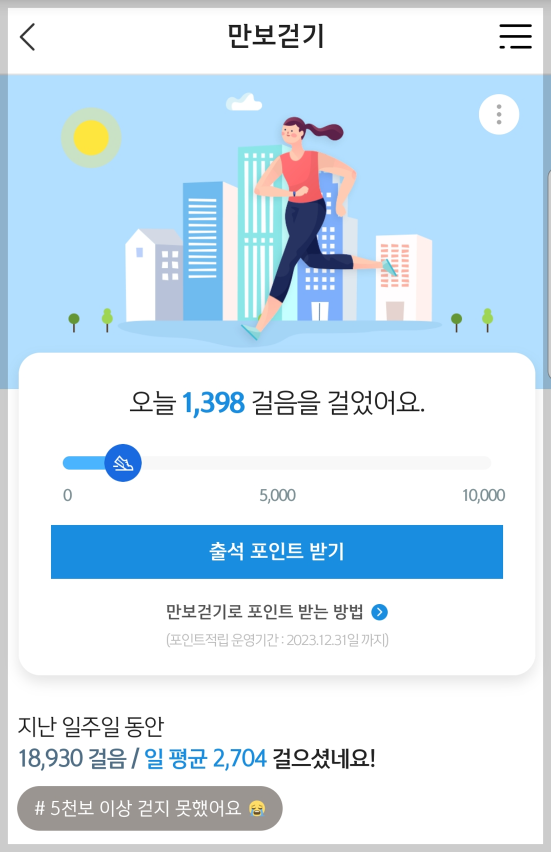 그리고 일주일간 하루 평균 5000보이상 걸었을때 300포인트