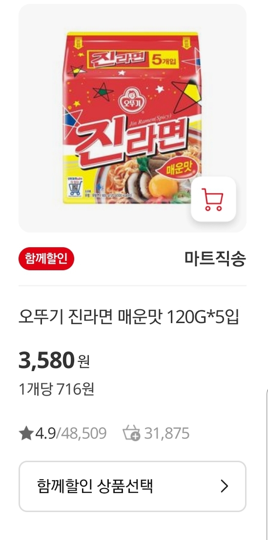 지난번에 친정엄마가 발견하시고 진라면5개 3000원이면 싼거라고 하셔서 검색해봤습니다